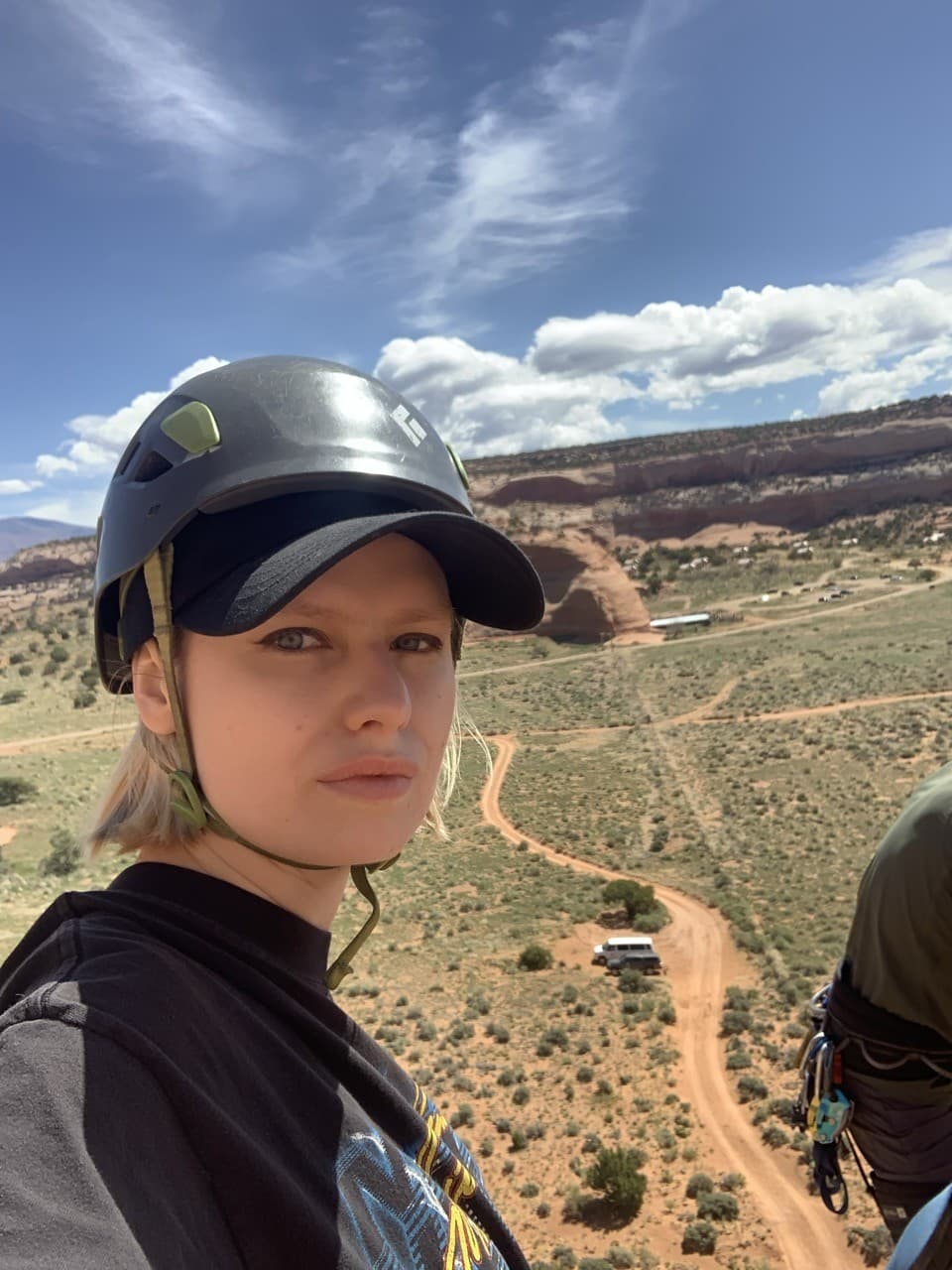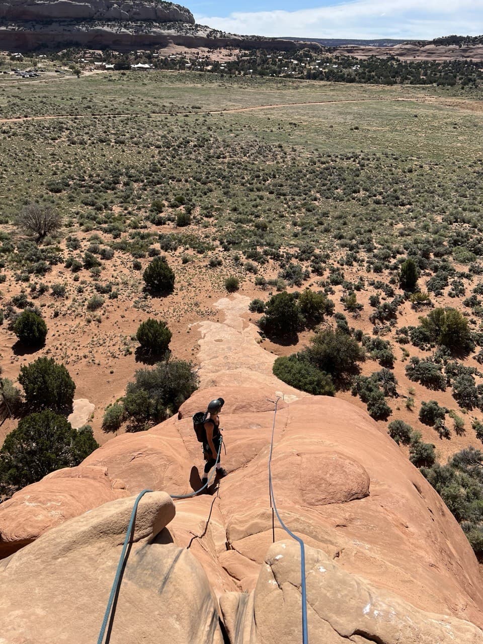 While you can take a stroll to Looking Glass Arch and quite easily nab a photo in its famous—for lack of a better word—hole, a traditional rock climbing experience up the arch’s spine is certainly something to write home about. In a group of four, you will be suited up in a harness, helmet, and climbing shoes, and a guide will coach you through all necessary steps of safety precautions and belaying. Our group was paired with a guide named Herb, whose easy-going demeanor and habit of punctuating every sentence with “no doubt” convinced me we were in the hands of a well-seasoned outdoorsman. When I asked him what kind of skills you need to go on this particular climb, he said, “No skills at all.” As someone who hasn’t been to the gym in four years and most recently pulled a muscle while sleeping, this was music to my ears. I would say the climbing was easier than anticipated, but I would caution that a fear of heights could be your number-one enemy. Luckily, you are clipped very securely into the rock at all times, so you feel more like a dog tied up outside a coffee shop than Alex Honnold from Free Solo (who Herb has climbed with many times). The biggest challenge for most would be the 140-foot free-hanging rappel from the center of the top through the arch’s opening. Herb will generously take photos of you at the outset of your rappel, so if you can muster an expression other than terror, you’ll get a great pic for your mom’s Christmas newsletter.
