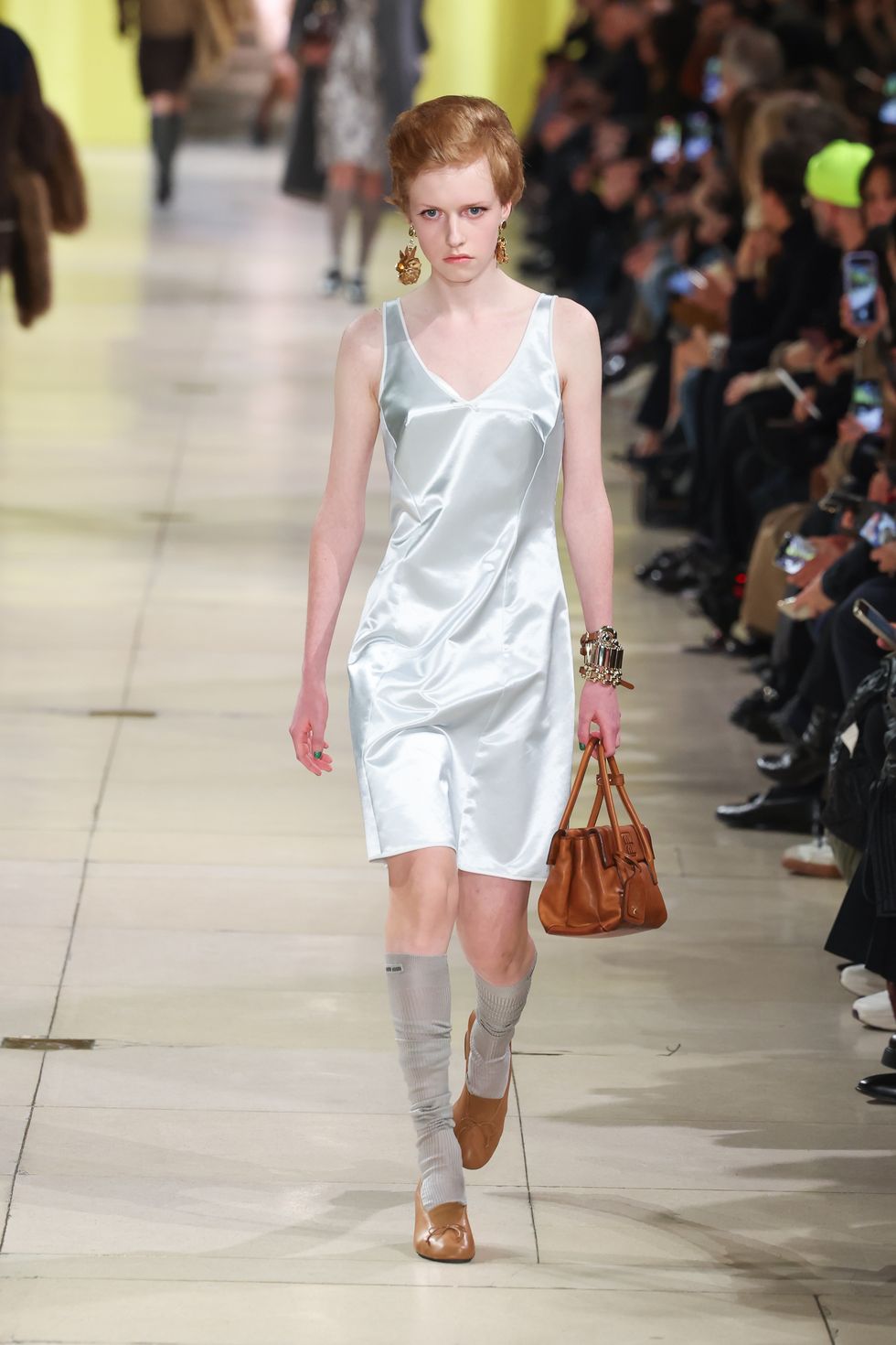 There are plenty of reasons why “youthful” underwear styles have made their way back into the trend cycle. The first and most obvious example can be traced back to recent runways, where silk and lace slip dresses and undergarments have featured throughout collections. Take Chemena Kamali’s Chloé Fall/Winter 2025 show, for example, where numerous models were clad in vintage-inspired lace nightgowns—even bloomers, the previous season—or Miu Miu Fall/Winter 2025, where Miuccia Prada explored the “typical accessories of femininity” through peeks of silk slip dresses and undergarments via overcoats and jacket hems. Elsewhere, at Ann Demeulemeester, Stefano Gallici employed softness and romanticism via powder pinks, lilacs, mauves, with camisoles and dresses crafted of chiffon that were lasered into English eyelet.