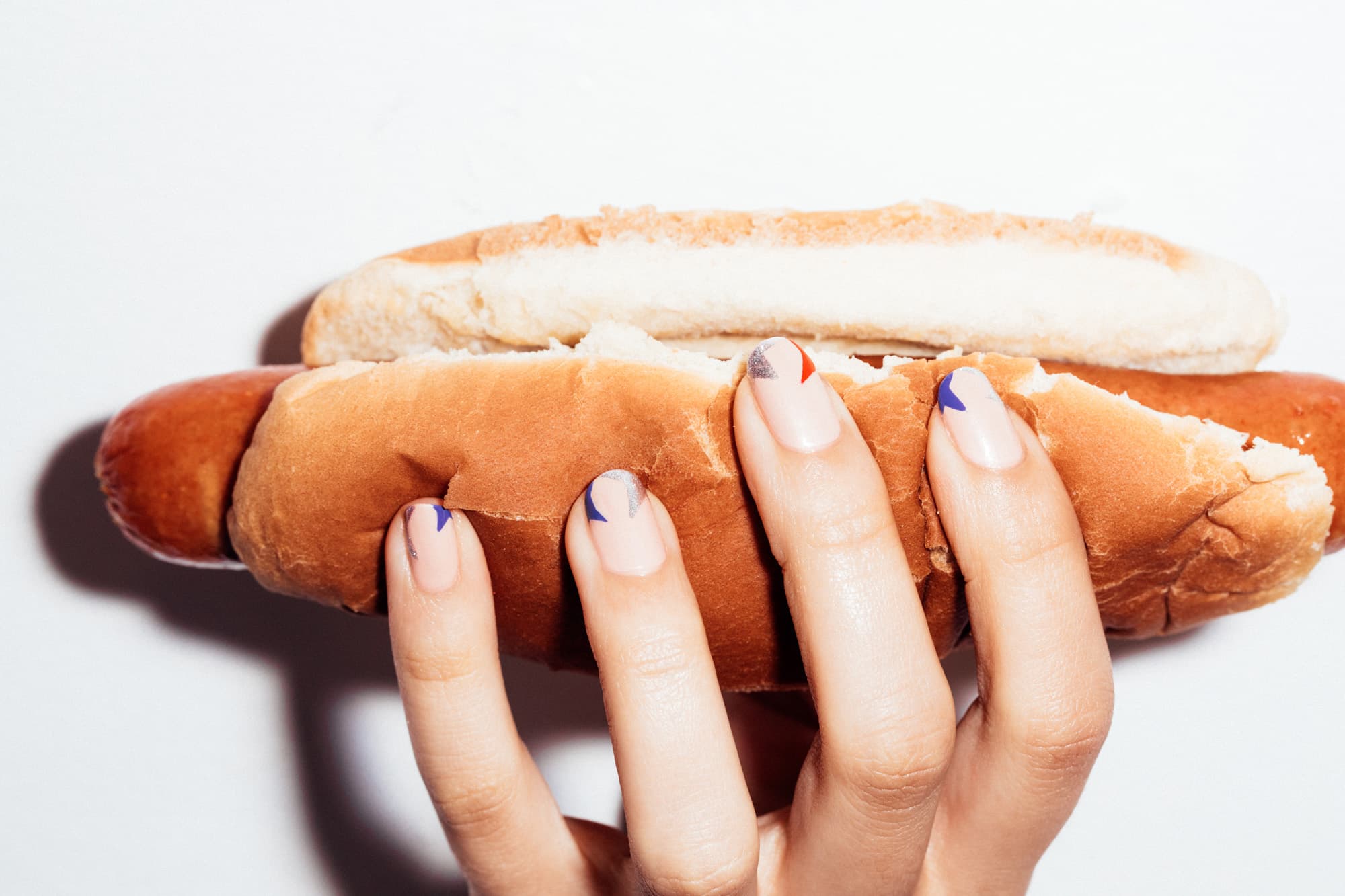that we would honestly wear year-round, and we found there is no better nail-modeling prop to show it off than a New York City hot dog. Ice cream cones are so last year.