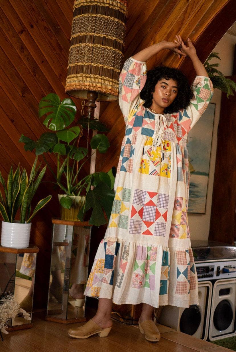 In a chicken-or-the-egg type of situation, garments that appear to be upcycled, whether that's a patchwork motif or a retro silhouette, are trending, which only helps the trajectory of brands like Mumford's. The granny-style quilt aesthetic that comes from piecing scraps of fabric together is more popular than ever, with those nowhere near the age to qualify as a granny.