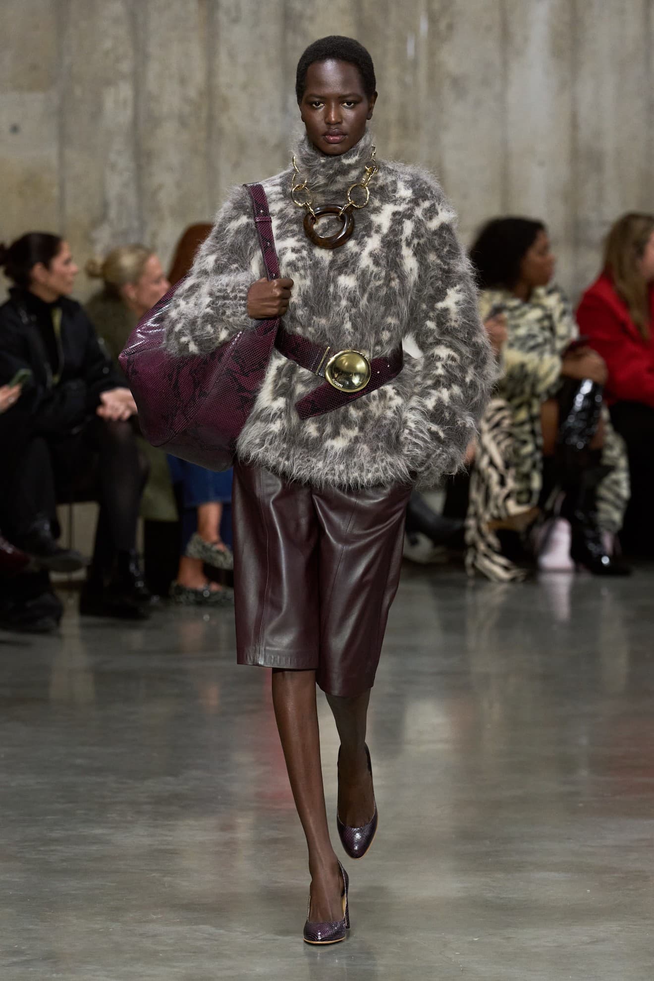 Three trends were embraced at once over at the Joseph show. A fluffy, faux fur, two-toned turtleneck top was accessorized with an oversized statement necklace, a snakeskin bag, and a perfectly coordinated snakeskin useless belt. This belt, worn loosely around the waist, added dimension by essentially cutting off the garment and introducing an additional texture and color into the mix. It also perfectly tied the bag, necklace, and brown leather shorts together.