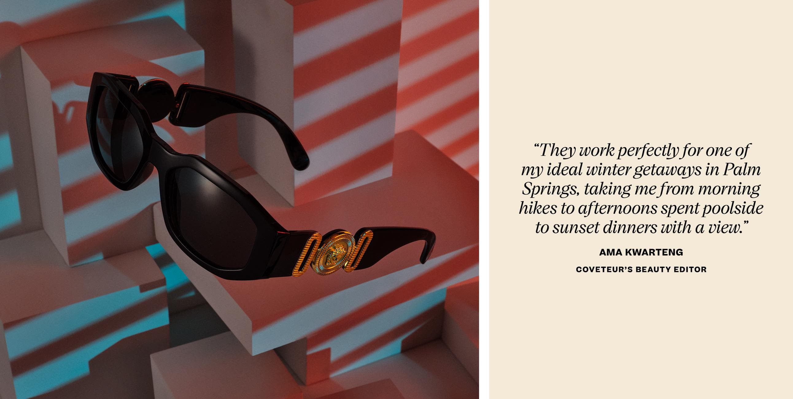 “The best everyday accessories are striking yet versatile. They can make even your go-to classics feel ingenious. That’s the energy coming from Versace’s frames as they flash a bit of gold at the temples. They work perfectly for one of my ideal winter getaways in Palm Springs, taking me from morning hikes to afternoons spent poolside to sunset dinners with a view.”