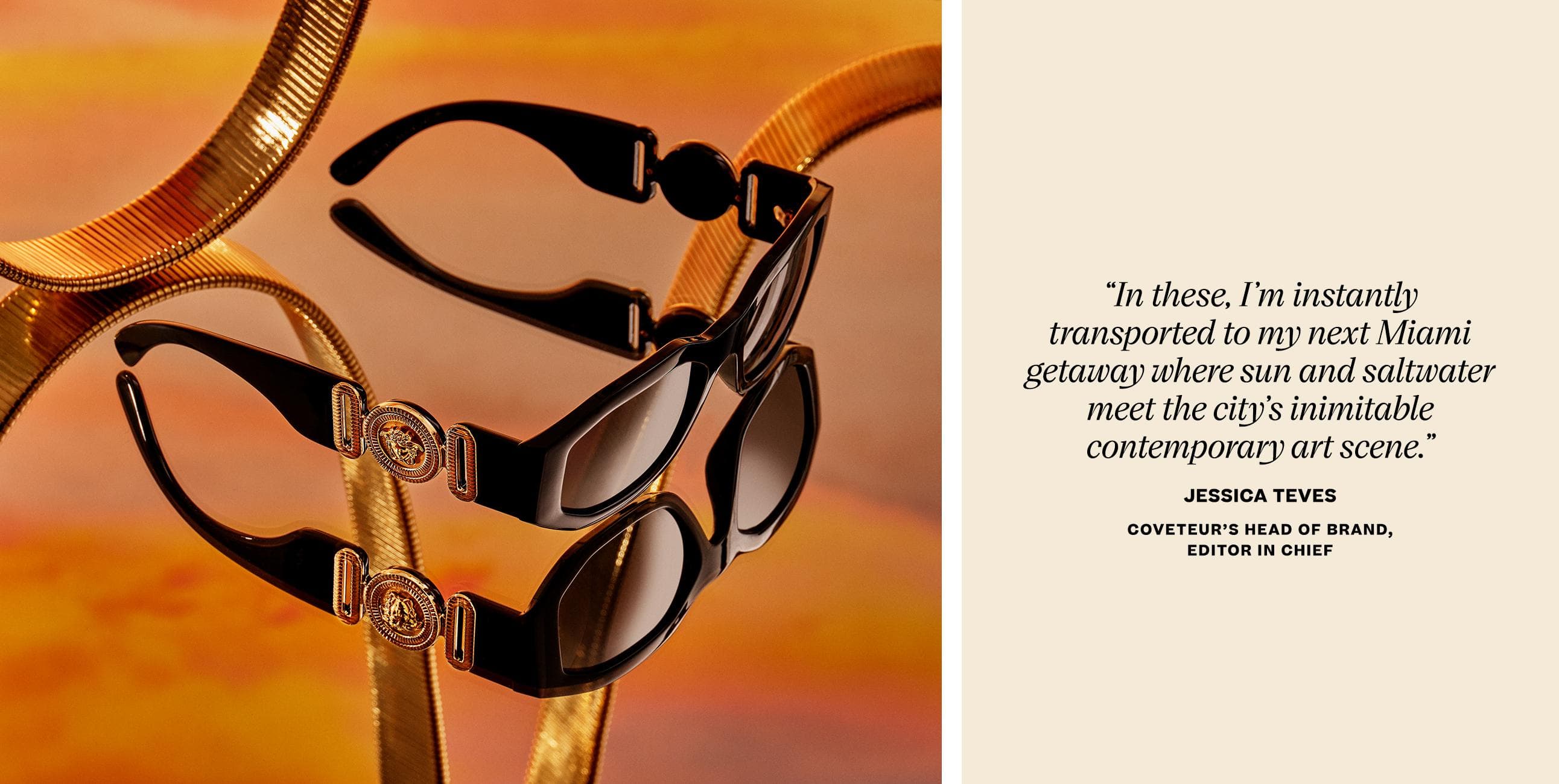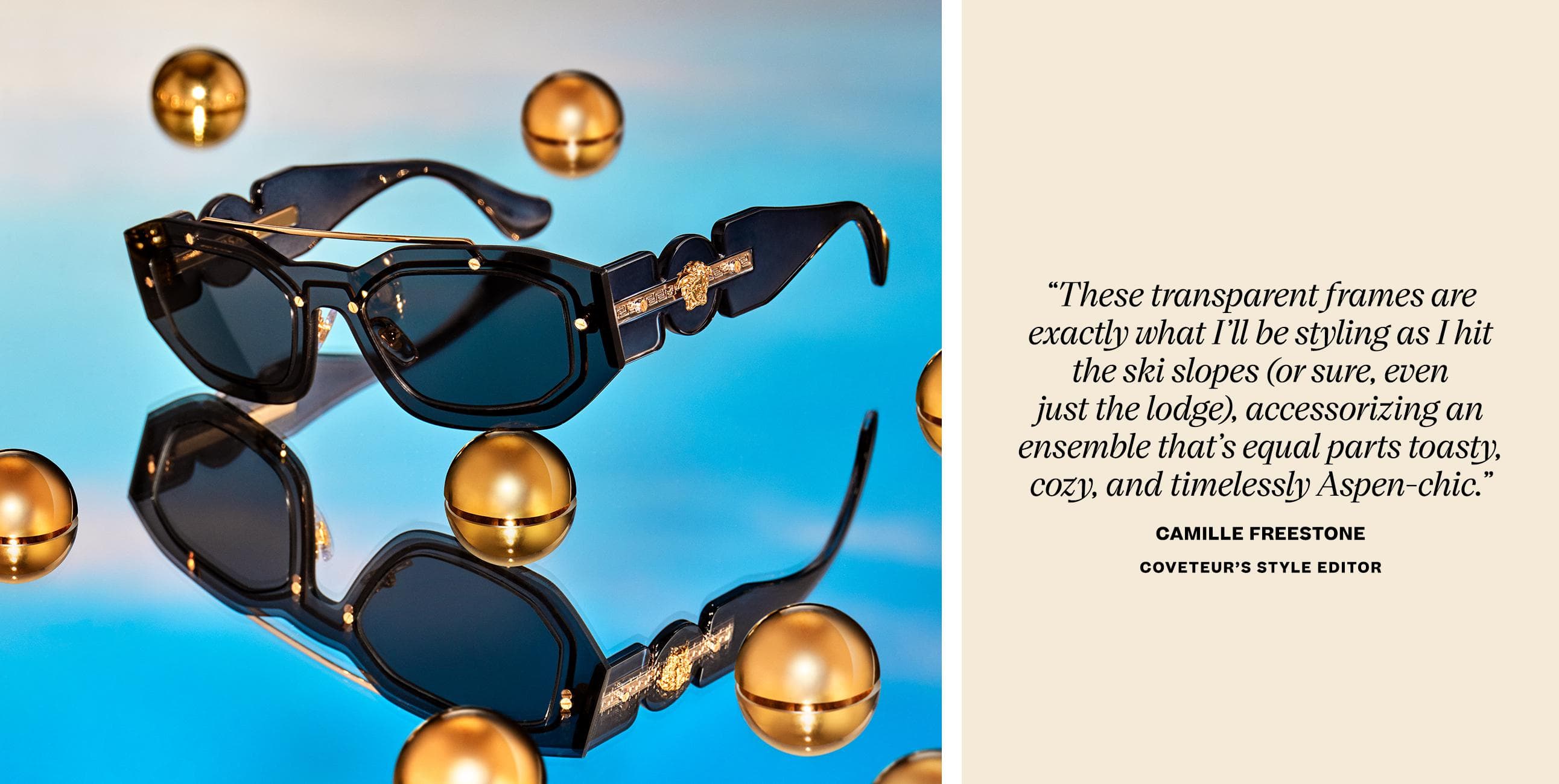 An amazing outfit has the power to move you. Think about your favorite pair of jeans that make you feel confident enough to enter a room full of strangers, or a dramatically voluminous dress that lifts your spirits even when you’ve just groggily rolled out of bed. Elevated accessories are no less magical and the specific ones our editors are eyeing for winter are a bit more literal in their ability to transport. Specifically, in the case of the Versace eyewear below, three of Coveteur’s own have found style as well as travel inspiration in one.