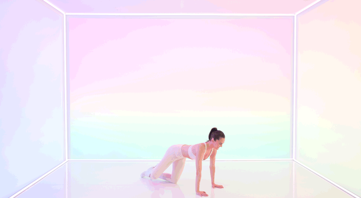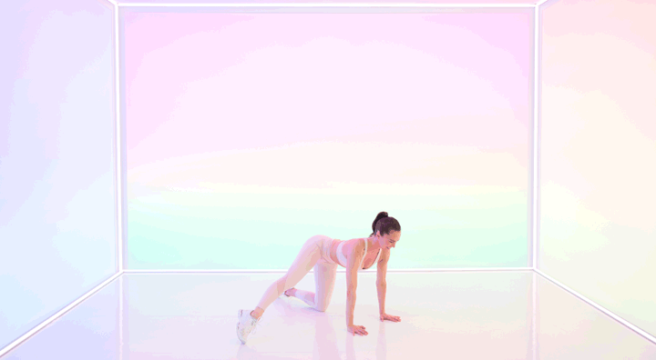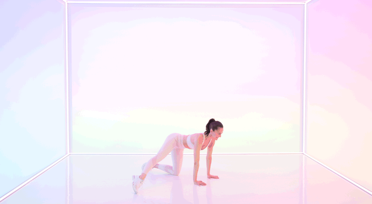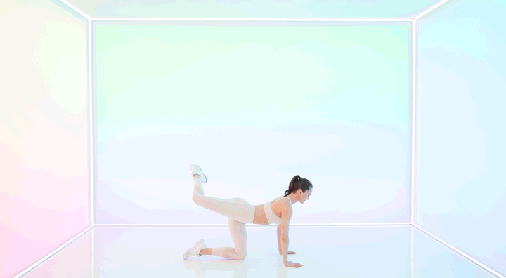 “Start in a kneeling position. Tap your right leg to the side. Squeeze your right glute as you lift and bend your leg into a 90-degree angle. Make sure the weight is evenly distributed in your arms. Lift your navel to your spine and press palms off the floor.”