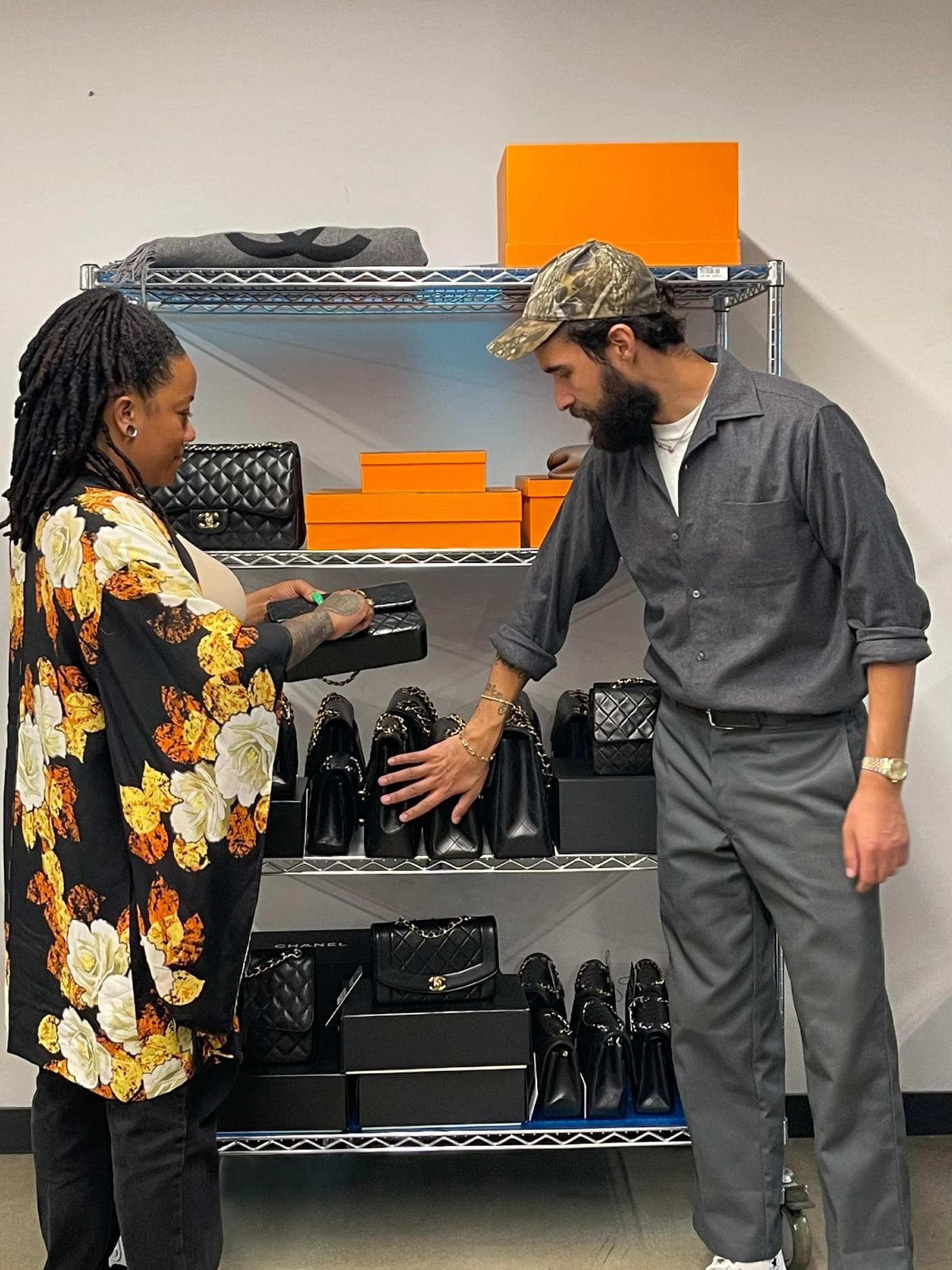 Once we’re done leafing through the racks, it’s time for a meeting with the head of authentication (who remains anonymous in this story at the company's request) in Guevara’s office, which is sparsely decorated to better emphasize the framed Hermès scarf on the wall. She’s currently putting together training for all employees to help them better recognize counterfeits—they’ve gotten really, really good. She’s scored a few helpful details through sources ranging from Reddit threads to PurseForum. She pulls up an extremely zoomed-in image of Chanel’s interlocking "CC" logo on an interior metal plate. Her research revealed that counterfeits actually created a more perfect-looking logo than the real thing. The originals all had a slight dip in the same place.