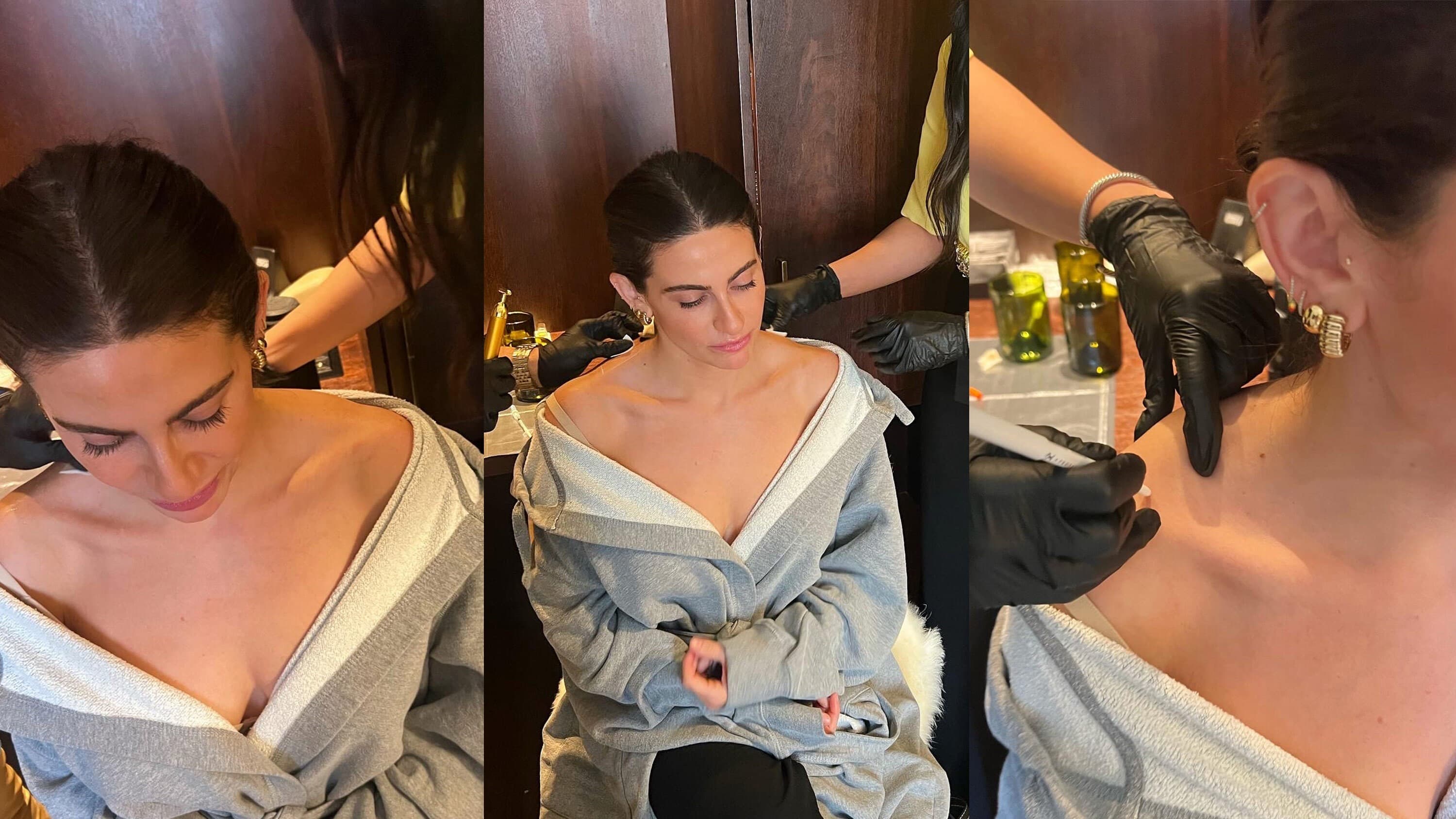 Before she began, Dr. Farhang mapped out the injection points on my shoulders with a white pencil, with about three to seven injection points on each side. She planned out the injection points by asking me to move my arms up and out in front of me. She planned to inject 20 units on each side. She explained that she typically injects 20-40 units in each trap. “I tend to be conservative with all tox [because], one—we can always add more, and two —these are muscles you actually need, and we don’t want to overdo and paralyze it,” she says.