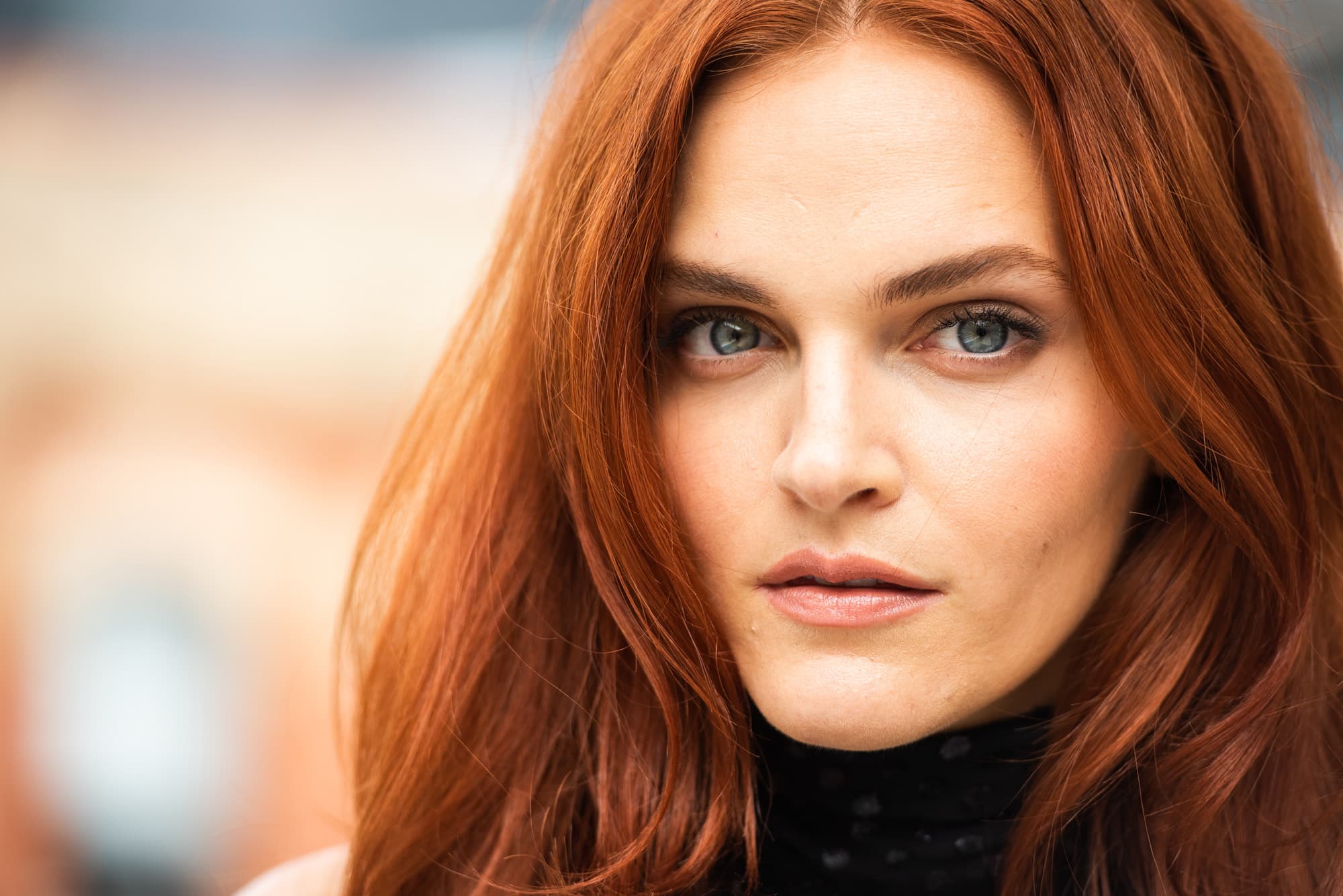. “Dawn is in two scenes, but it’s about finding every little piece about [the character], getting their personal history, and understanding what brought them to where they are now,” she tells us. Her fiery red hair whips around at the sight of a bee—Brewer has never been stung and doesn’t want to risk it. We’re on the rooftop; down below, a crowd of celeb-spotted hopefuls linger around the velvet rope cornering off the entrance to