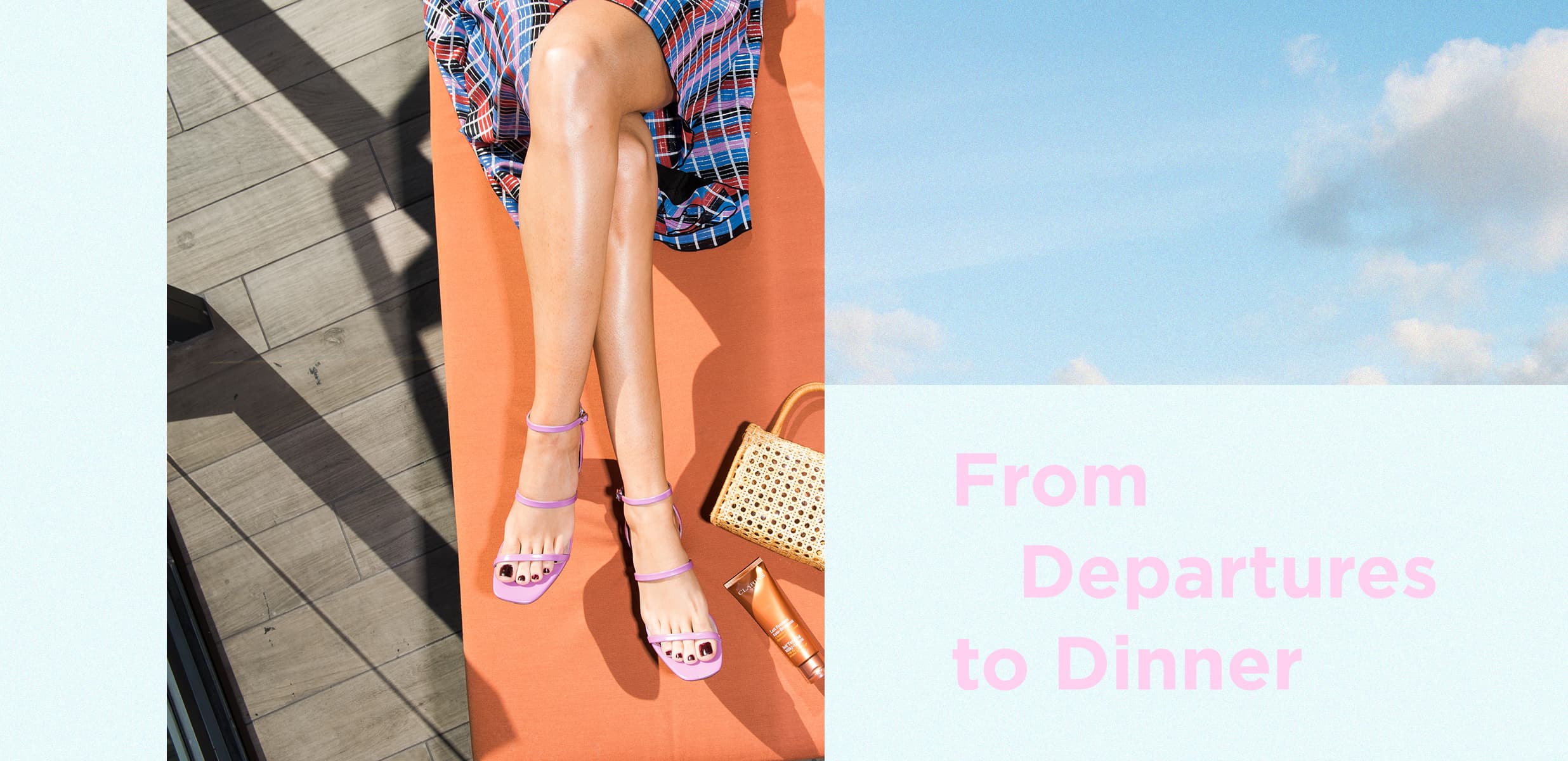 There’s no greater stress than landing at the airport, having to collect your luggage, checking into your hotel, and then rushing to make a dinner res in actual record time. For that reason, we love to pack a sure-fire look that, with the right accessories, is the type of thing you can wear just about anywhere. Enter this flirty, printed wrap dress from Wayf, finished off with ultra-feminine ruffles and threaded metallic stripes that catch the light. A sweet woven basket bag and glossy lavender sandals add an unexpectedly edgy pop, collectively making it the perfect outfit for a stroll by the beach before dinner or late-night drinks and dancing.