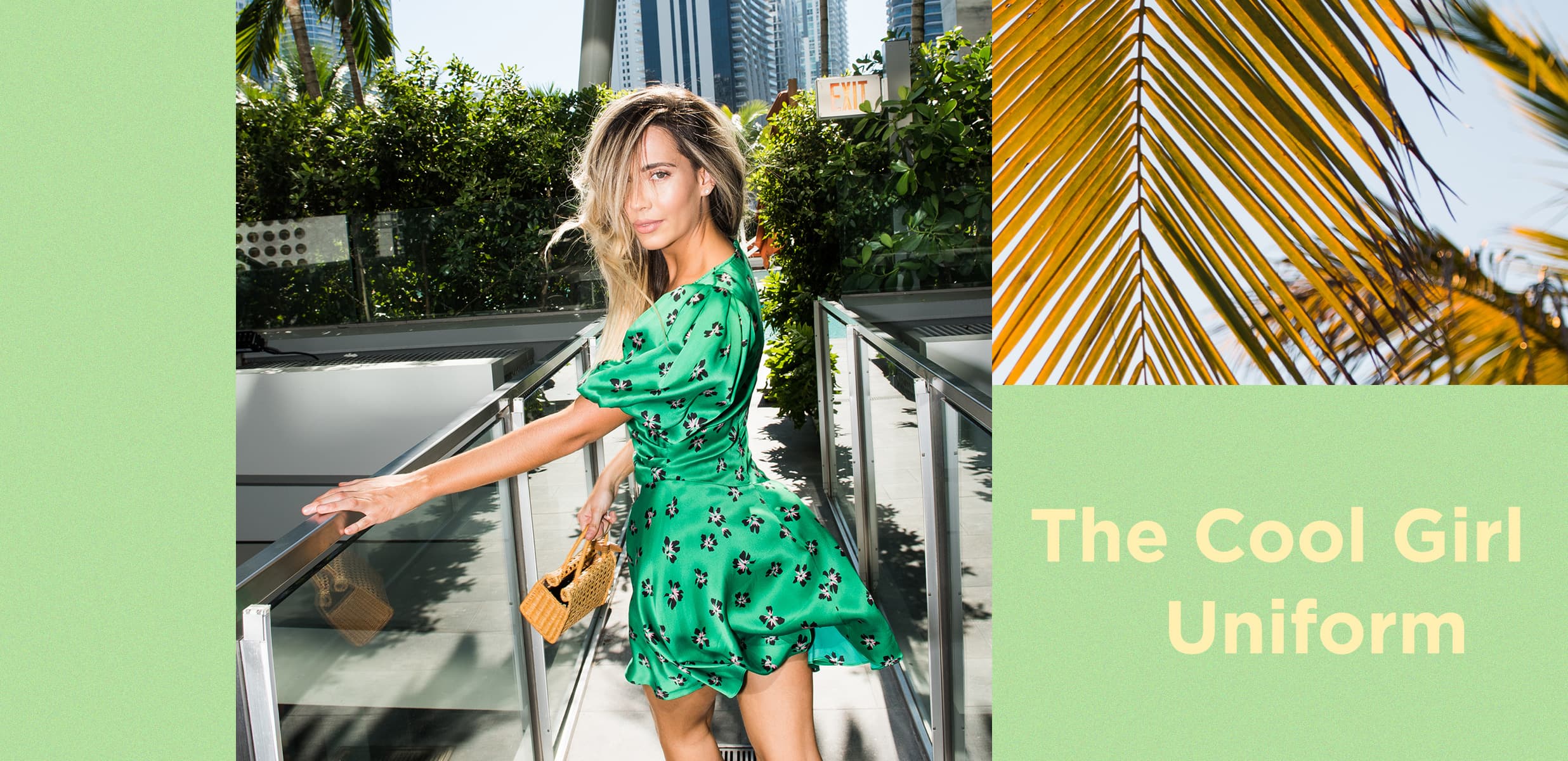 Whether you’re wandering through Wynwood or doing damage in the Design District, this two-second outfit formula is pretty foolproof (and very French Girl™). A breezy little silk dress in an eye-catching hue (emerald green) is equal parts polished and pretty and gets considerable cool-girl cred when paired with a pair of low-key white sneakers. Add in a little basket bag (that carries not much of anything, but wasn’t minimalism your 2019 resolution?), and it’s a cinch for a day of strolling and exploring.