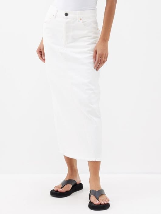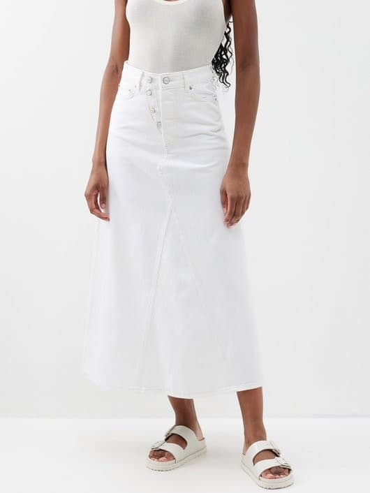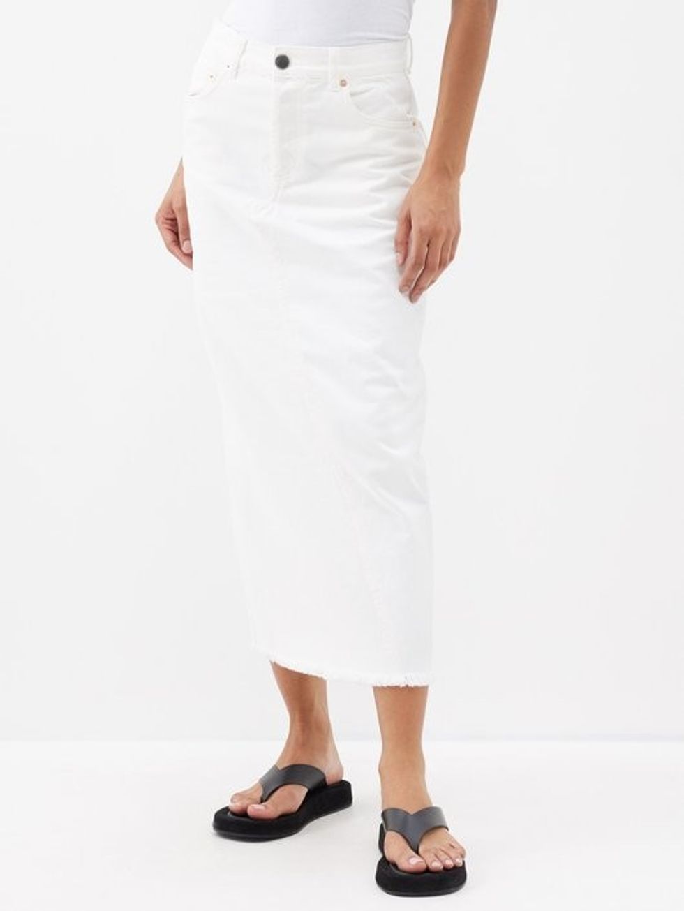 A denim maxi skirt in any color is a solid addition to your wardrobe, but this season we’re particularly partial to the creamier varieties.