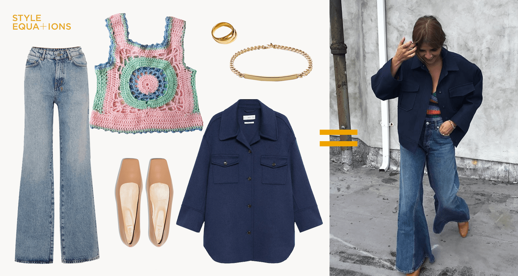 Right photo: Courtesy of Instagram/@julianasalazarFor those of you who embrace color in moderation, we recommend opting for navy or blue denim separates while letting a patterned tank just peek out from beneath. Simple brown leather shoes will then ground the look.