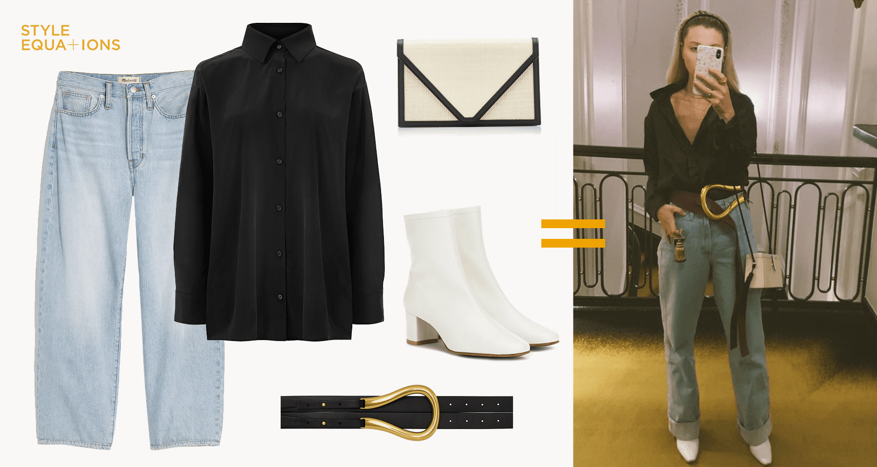 Right photo: Courtesy of Instagram/@kerrypieriWe love an ensemble that serves as a frame for statement accessories, particularly this architectural belt. A silk button-down and white boots are the perfect complementary options.