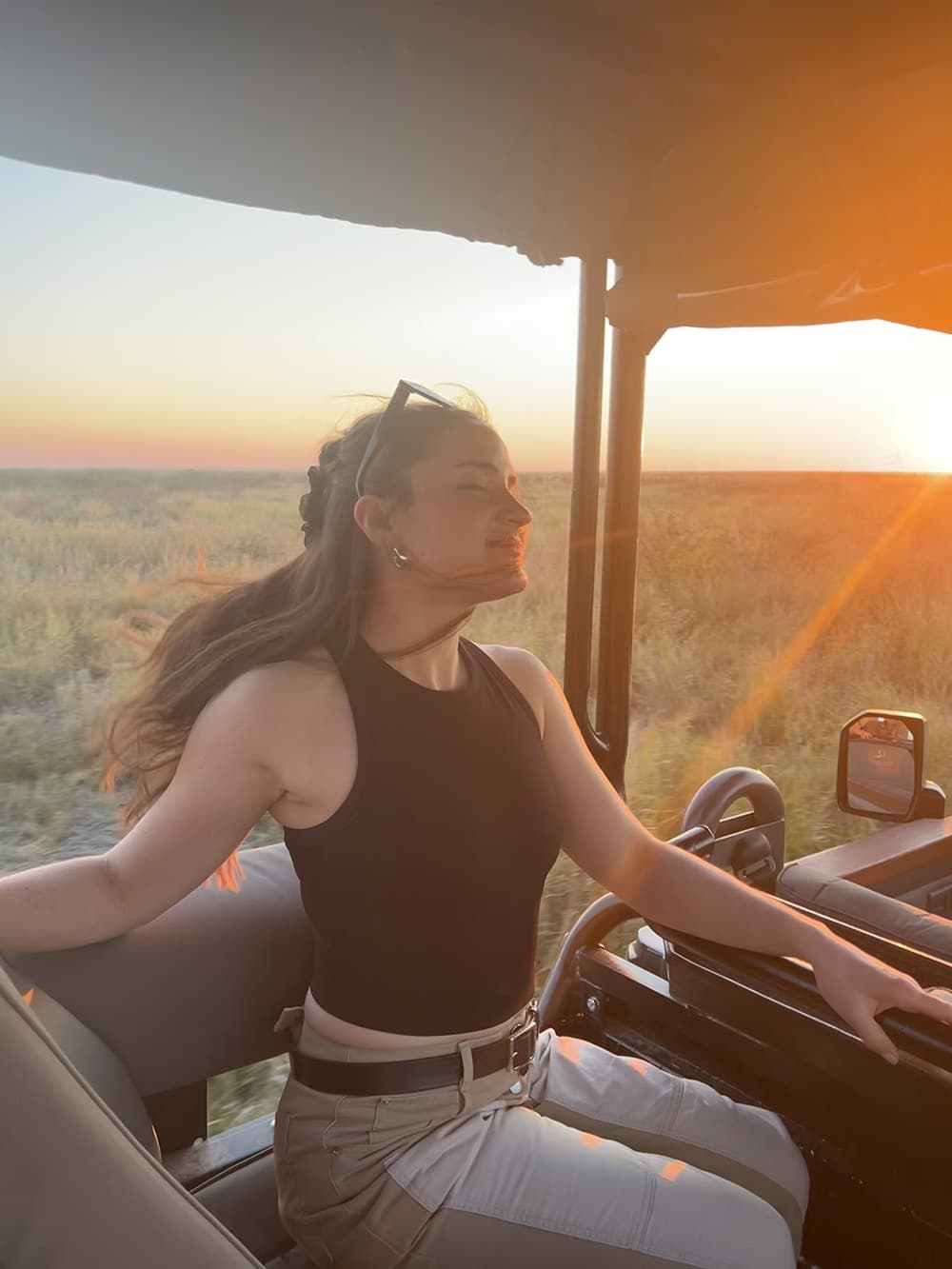 Still, I am who I am, and that person was thrilled to arrive at DumaTau, which was definitely the most resort-like stop of our journey. With its riverside views—which could be seen from my room, a sparkling pool, and well-equipped gym—this was a place that felt most aligned with my new habit of shamelessly taking nonstop selfies when the Botswanian morning and evening light was at its glowiest. It also was, I decide, the ideal backdrop for the cut-out Baobab dress still languishing in my suitcase. I break it out one night with a pair of (also untouched) high heel mules, and a man from the Wilderness team offers to take my picture. “My wife hates every photo I take of her, but I’ll try,” he says before proceeding to set up several shots like a pro and hype me up with a “work it, girl.” We get the shot right before my stiletto gets stuck in the holes between wood planks and I nearly faceplant. The night sky darkens and I spend the meal with my outfit completely obscured by two blankets, both of which I keep swaddled around me as I very carefully try not to trip on the way back to my room after eating.