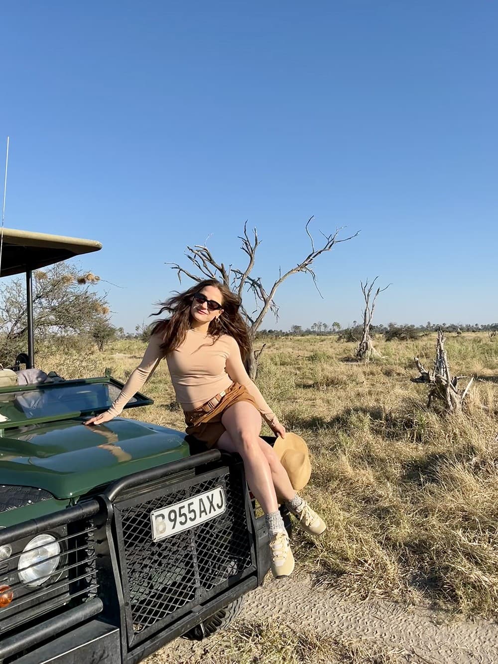 Alison Syrett ClearyThis last point is something I grossly underestimate as I get dressed before dawn on my first morning in Chitabe. Amongst my meticulously planned safari looks is an adorable matching short and jacket set from Halfdays in nut brown, and I’m determined to make it work, weather be damned. I figure that the top part of my body is what usually gets cold anyways, and team the outerwear with a beige long sleeve shirt from The Park and a nubby cream Doên cardigan. Within five minutes of leaving my room I’m undeniably freezing, a fact I stubbornly refuse to admit as multiple staff members ask if I need to go change. Instead I gulp down the hottest coffee I can muster and clamber into the safari vehicle, where I find that a hot water bottle and insulated poncho are mercifully waiting for me. These keep me toasty as the temperatures slowly climb about thirty degrees over the next two hours. I emerge from my cocoon on our mid-morning break feeling good enough about my outfit to ask someone to take a picture of me sitting on the hood of our car. (Okay, multiple pictures.)