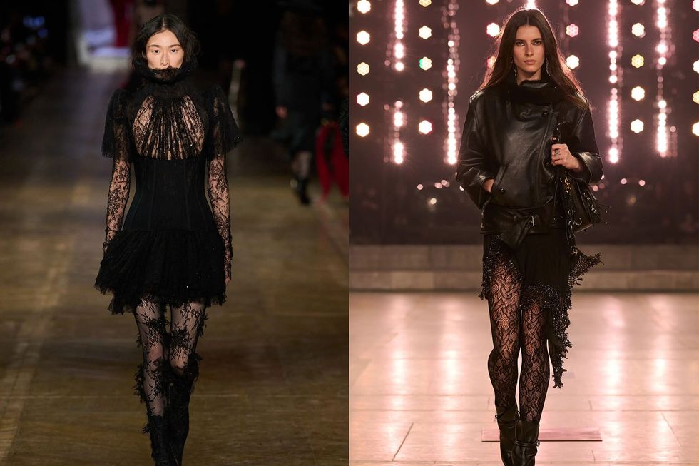 In the hosiery department, lace tights made an appearance on last year’s runways, both at Valentino, McQueen, and Isabel Marant, adding a sense of glamor and rock ’n’ roll to each look. At Isabel Marant, lace tights were paired with mini dresses and leather jackets, while at McQueen, it was all about lace on lace—models departed onto the runway in black lace dresses paired with lace tights, offering consistency to the looks.