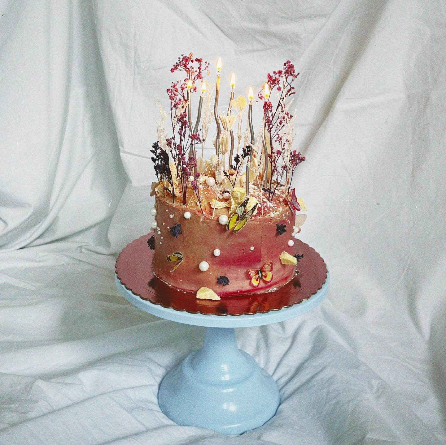 Dairy-free and almost always vegan, Ginger Mayo’s intricate personalized cakes look as though they came out of a garden fairytale: flowers, pastel candles, and butterfly cake toppers are arranged atop the tiered layers of the beautiful and realistic-looking desserts. Mayo—who works full-time for Rethink Food, a food insecurity non-profit—began making cakes in her kitchen as a hobby and now her delectable creations (which also double as stunning centerpieces) have been enjoyed by celebrities like Billie Eilish and Dua Lipa.