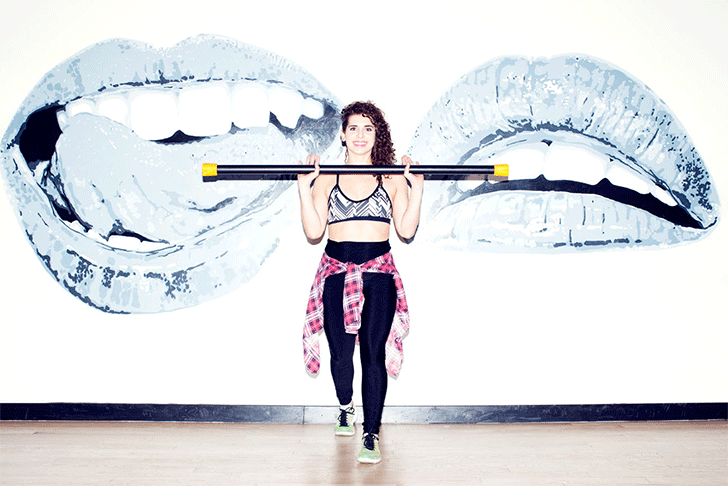 This lower-body exercise will get your butt tighter and lifted. It also works your thighs and obliques (abs) for an added bonus.”“Start in a lunge position, with your right foot back and your left foot in front. A body bar is resting on your shoulders. Lower into a lunge position as your left knee hovers just an inch over the ground. Both knees have a 90-degree bend. As you come up, press the body bar up past your head and into the air. Your arms will straighten upright, without locking. Bend your knees back into a lunge and lower your hands at the same time. Repeat.”
