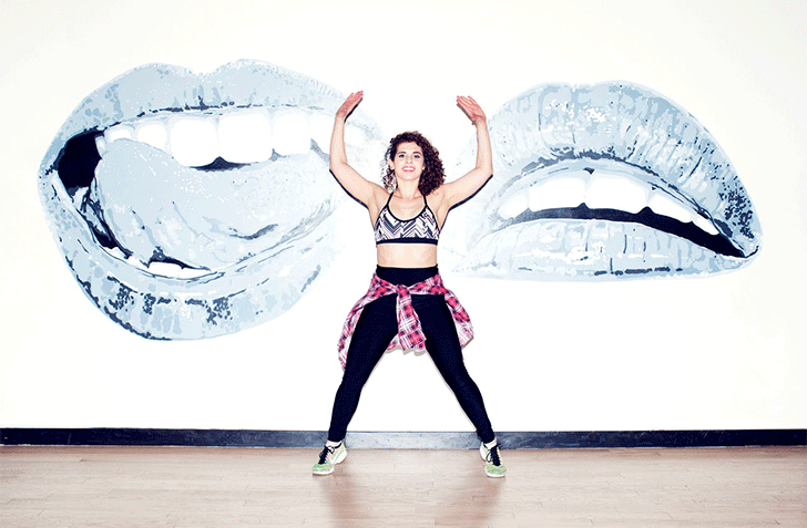 This works your glutes, inner thighs, lats (back), and obliques“Start with your feet hip-width apart. Shuffle to the side for three seconds, moving your feet quickly, like a linebacker on the field. Pause. Punch right, punch left. Shuffle to the left. Punch left, punch right.”