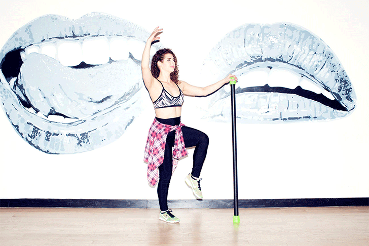 This dance-inspired pose will give you lean, lengthy quads without over-bulking. It also works your core and balance, an important skill for any athlete-in-training.”“Stand with your feet together, hands on hips. Use the body bar (upright) for balance. Hold on to the bar with your right hand and raise your left hand high in the air. Raise your right leg out in front of you, as if you were kicking with your leg straight. Keep your right leg high, engaging your core for balance. Bring your right ankle into your body, keeping your right quad out and high. Extend the lower half of your leg out again, firing up your quads. Repeat 15 times. Lower your leg and start on the left. Try for one set on each leg.”