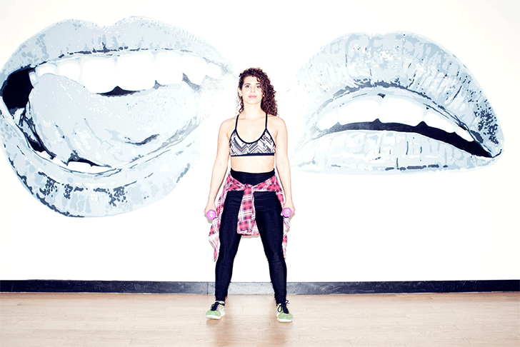 “Start in a standing position, your feet a bit wider than shoulder-width apart. Squat with your butt back and your back straight, keeping your eyes focused a few feet in front of you (and not on the ground). As you raise out of the squat, raise your right foot off the ground to the side, and up to your hip level. Use the strength of your left outer quad and your right glute to gracefully lower your leg back down into a squat. Alternate on the left side. That’s one rep. Try 30 (15 on each side).