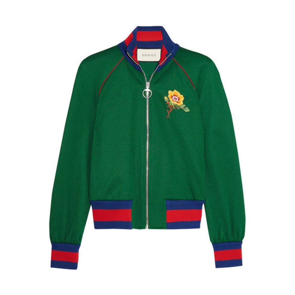 1. Gucci Appliquéd Satin Jersey Bomber Jacket: I’m choosing a different Spice Girl, Victoria Beckham, the one who has sports viewing in her blood. While I wouldn’t copy that haircut for a million dollars, I will take this outfit, starting with a stellar bomber jacket.