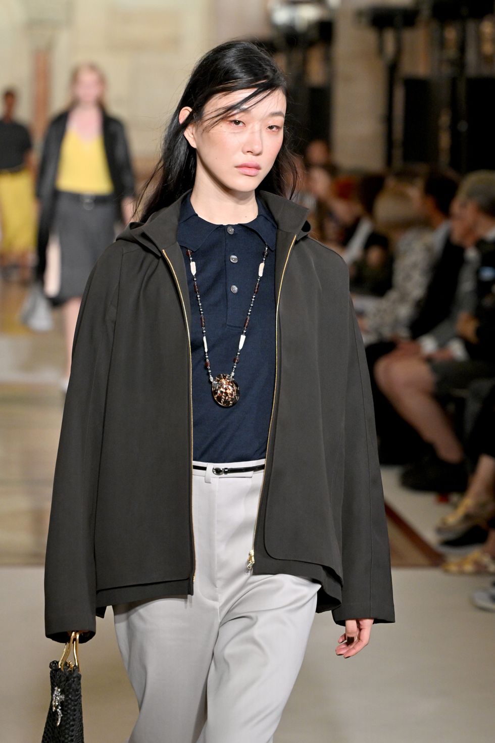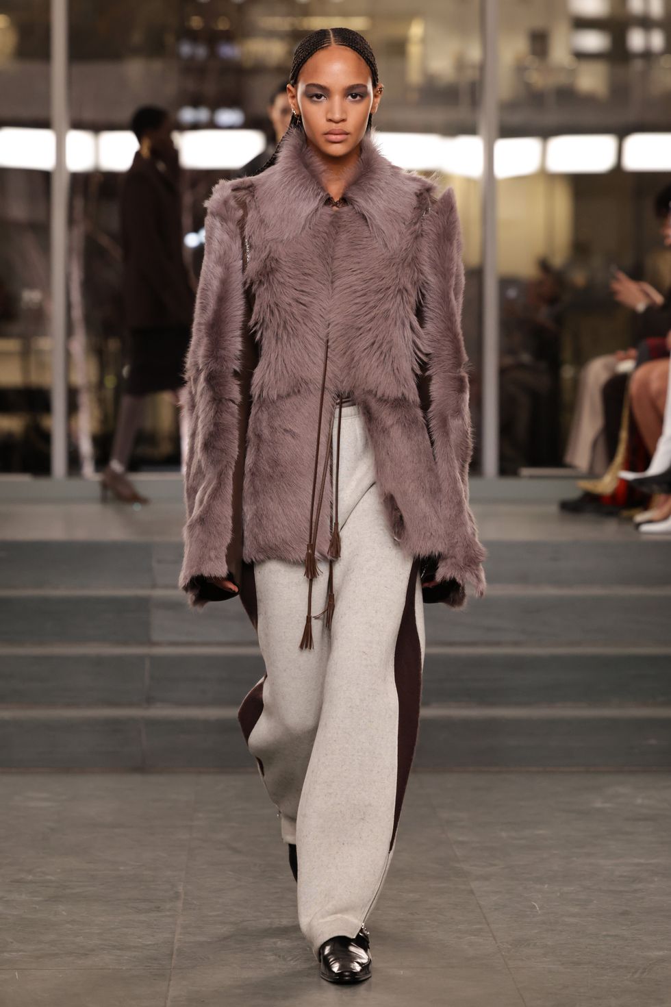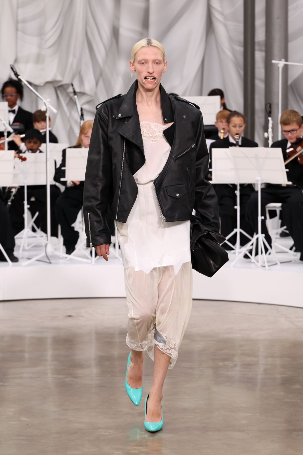 The technique is a favourite of Tory Burch, too, who for both Fall/Winter 2025 and Spring/Summer 2026 has dabbled with the theory, pairing a fur jacket with grey sweatpants, or a techy utility windbreaker with a polo and formal slacks. Elsewhere for Spring Summer, Glenn Martens used a classic technique of underscoring a hyperfeminine lace slip with an oversized black biker jacket, to give everything a sense of toughness.