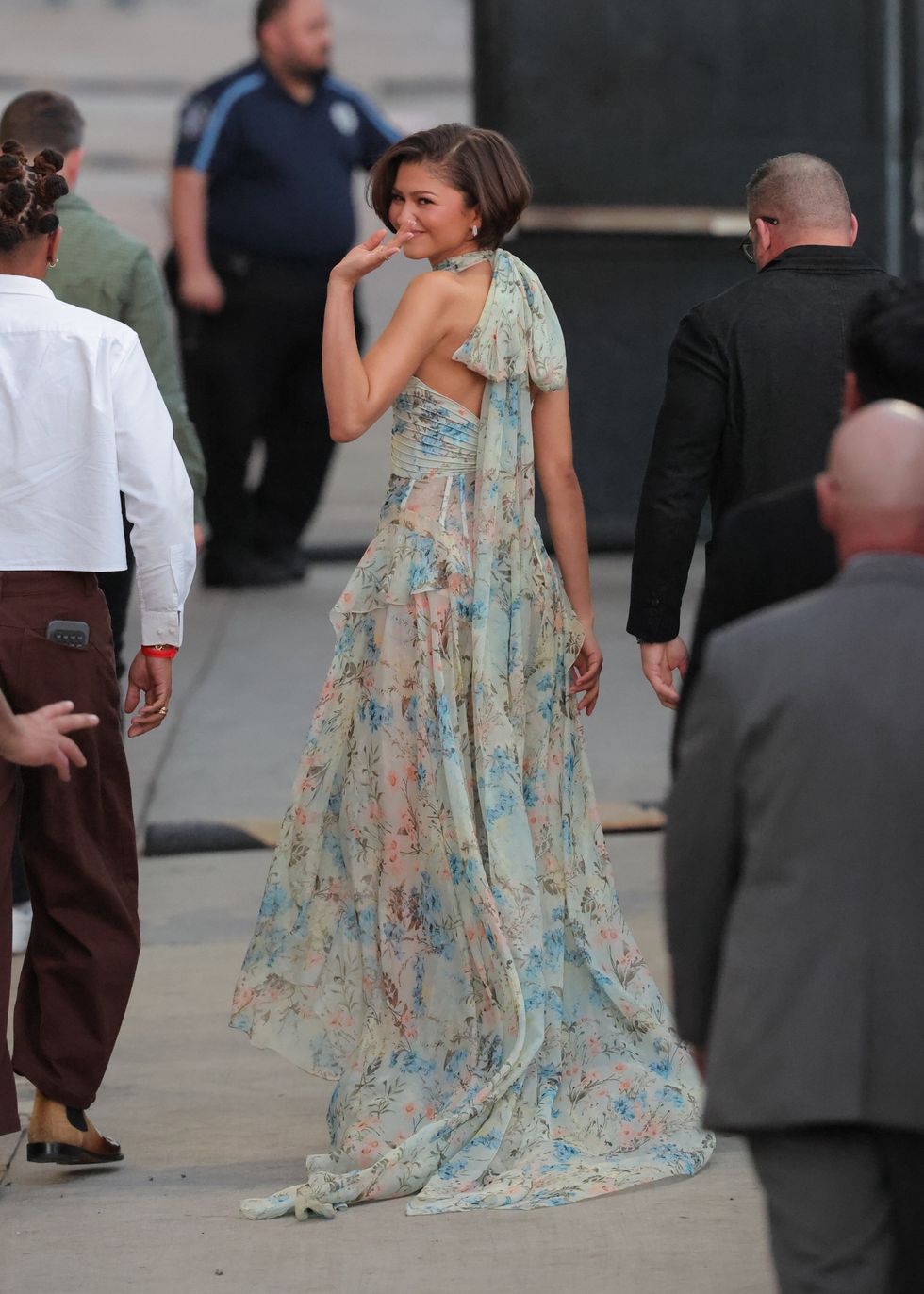 Zendaya arrived to shoot Jimmy Kimmel Live! in a gray blazer and Bermuda short set from Moschino's Fall 2026 collection, a white button up top underneath with long, dramatic ruffles, and pointed white pumps.