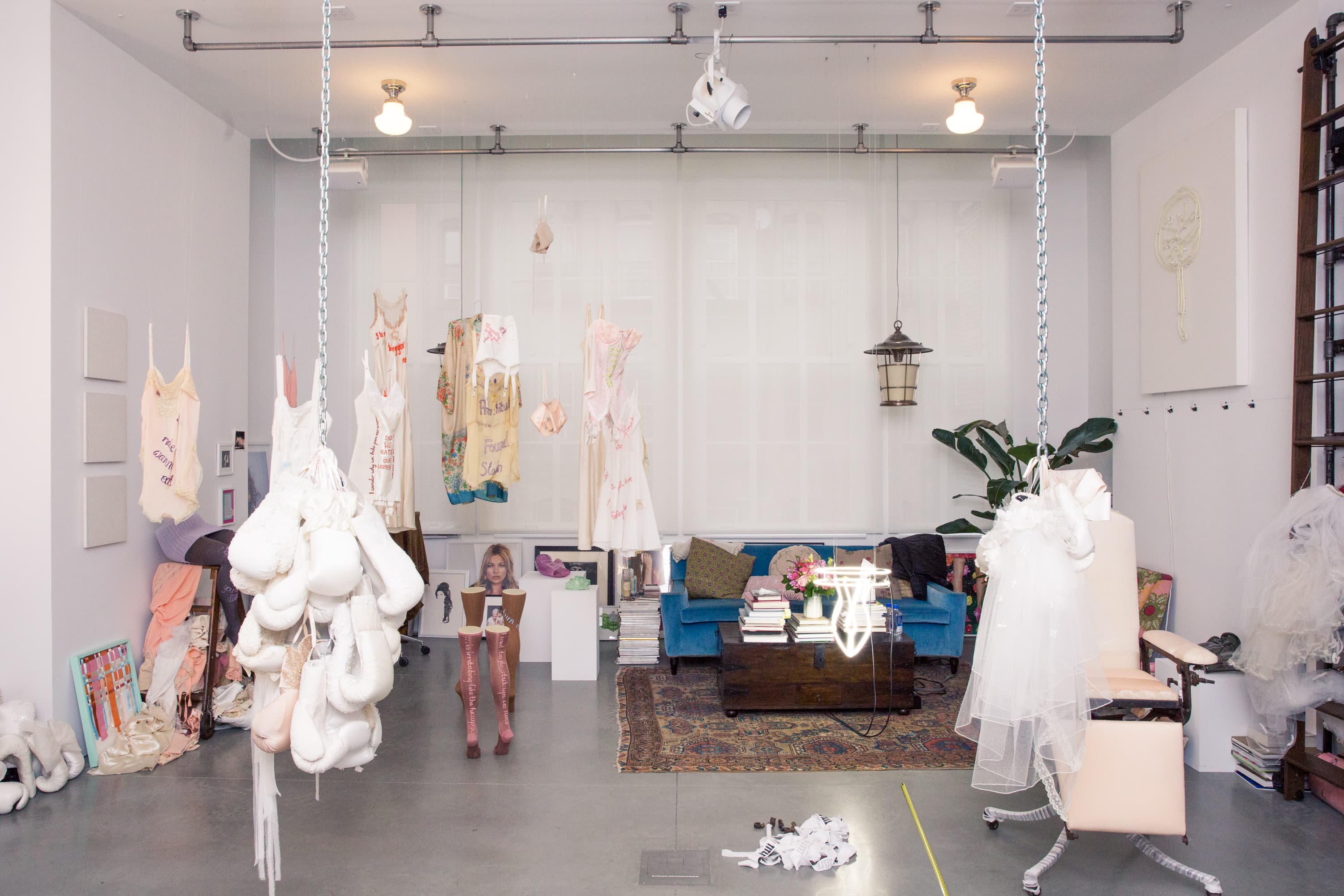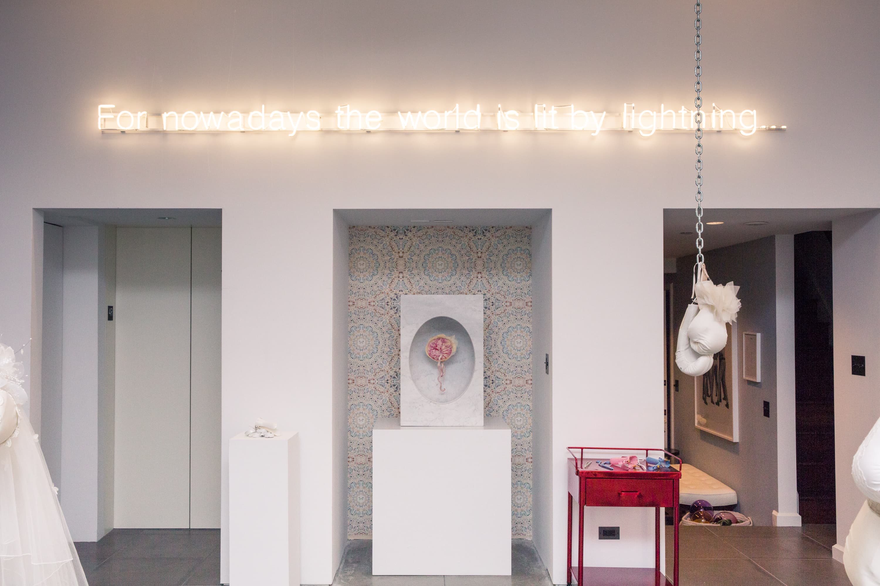 When I first walk into Zoë Buckman’s studio, I see everything all at once. There is neon, textile and glass. There are white boxing gloves covered in lace and gynecological instruments covered in patchwork quilt. There are words and lyrics and phrases.