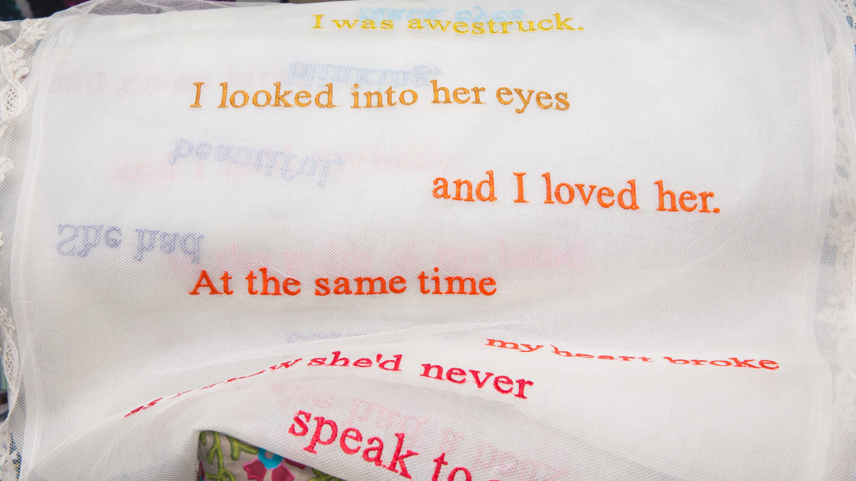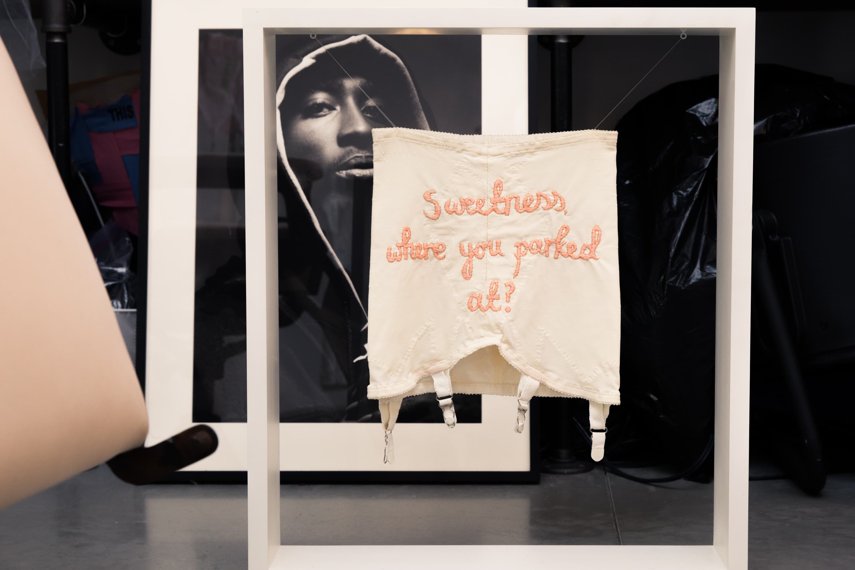 On my way out I look at another piece of red and black lingerie. “If it was dark, it was because she was a prostitute” Zoë tells me. There was a phrase from Tupac’s song embroidered on it in bright blue. “I thought I couldn’t put a degrading lyric on that. I wanted to put something on there for her, whoever she was. To lift her up.” It feels entirely different than anything else in the room and yet entirely the same, a cry for women to stand up and fight back: