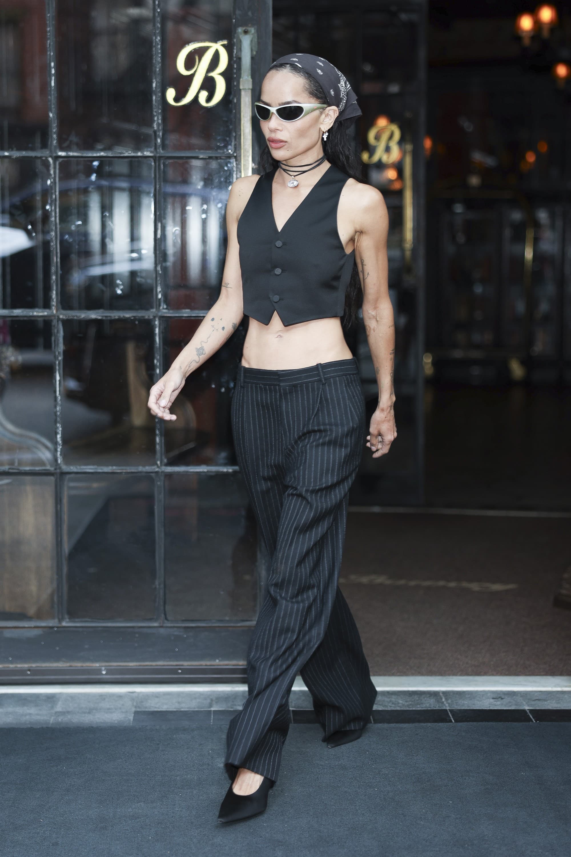 Getty ImagesStepping out for an appearance on “Late Night With Seth Meyers” to promote her new film, “Caught Stealing” with Austin Butler, Kravitz’s entire look, from head-to-toe, was inspired by vintage fashion eras. Styled by Danielle Goldberg, the actor paired a custom Saint Laurent cropped '90s-esque suit vest top with low rise pinstripe pants, accessorized with vintage silver sporty Nike VSN sunglasses, a wrapped Jessica McCormack choker, and, of course, completed the look with a classic black and white bandana. The outfit served as a reminder that '90s trends will always be relevant.