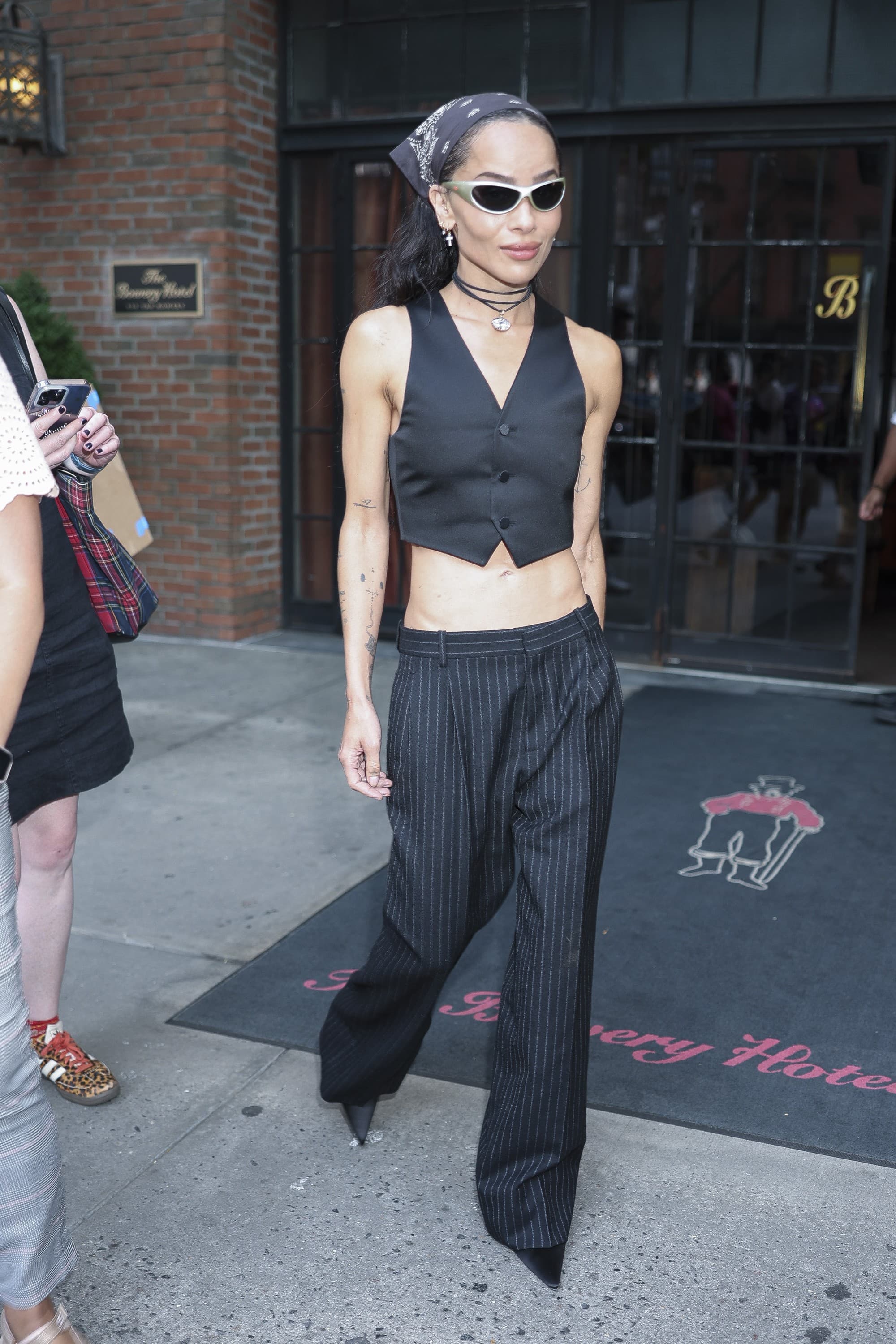 Getty ImagesFor an appearance on “Late Night With Seth Meyers”, Kravitz pulled inspiration from eras past: a cropped black waistcoat, wrapped choker, and vintage silver Nike sunglasses, for example. The look is, of course, completed with our favorite detail of all: a classic black and white bandana tied at the back of her head, '90s-style. She also reminded us that a slightly baggy low-rise trouser will always look effortlessly cool. Bonus points if they're pinstriped.