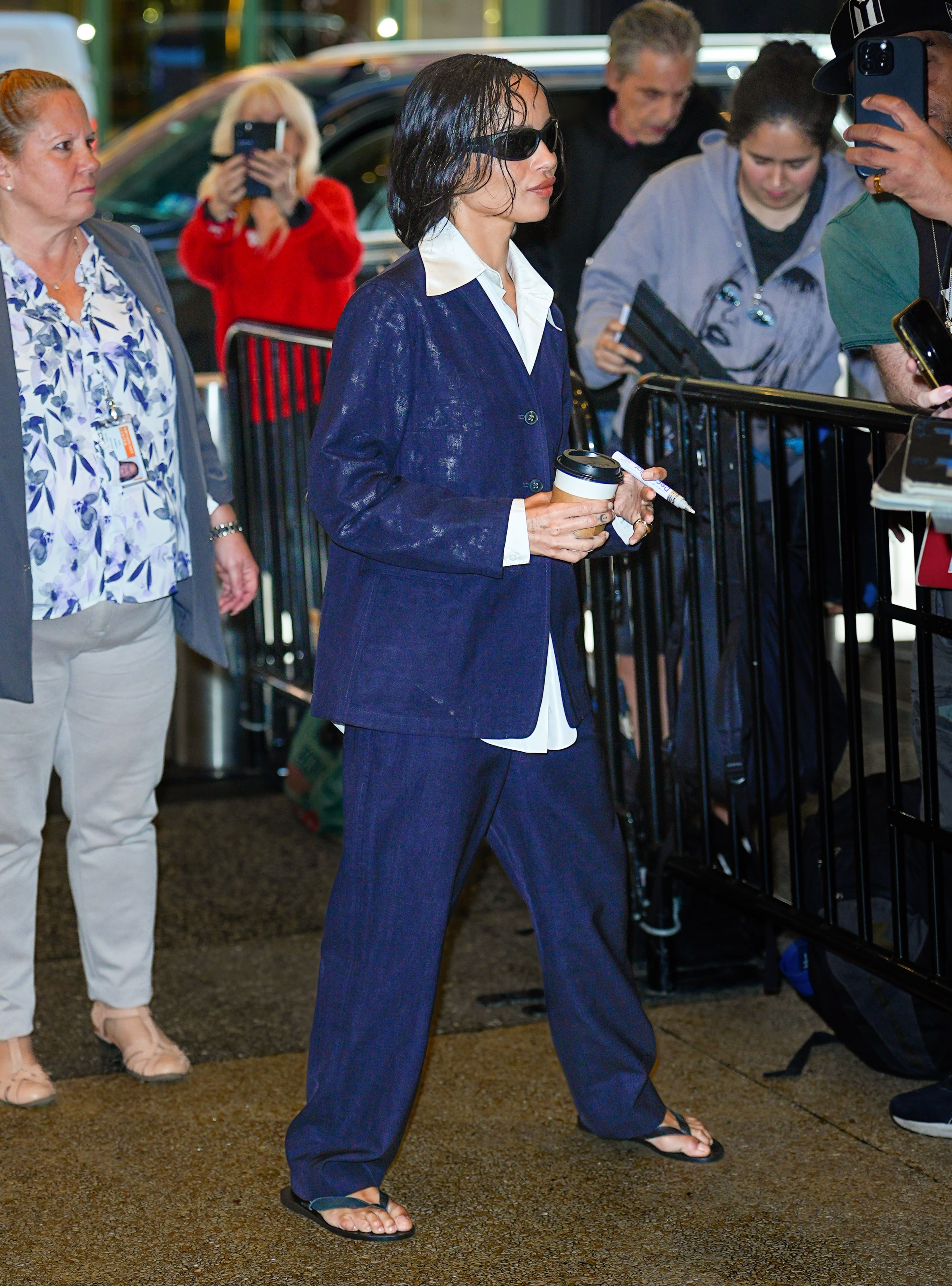 Getty ImagesWith a wet hair look and coffee in hand, Kravitz greeted fans in a relaxed, unstructured navy-blue set and did what some of us may have previously thought of as unthinkable: paired a dressy suit-inspired look with flip flops. In other words, Kravitz has us rethinking the "rules" of styling, and if there are any rules at all.