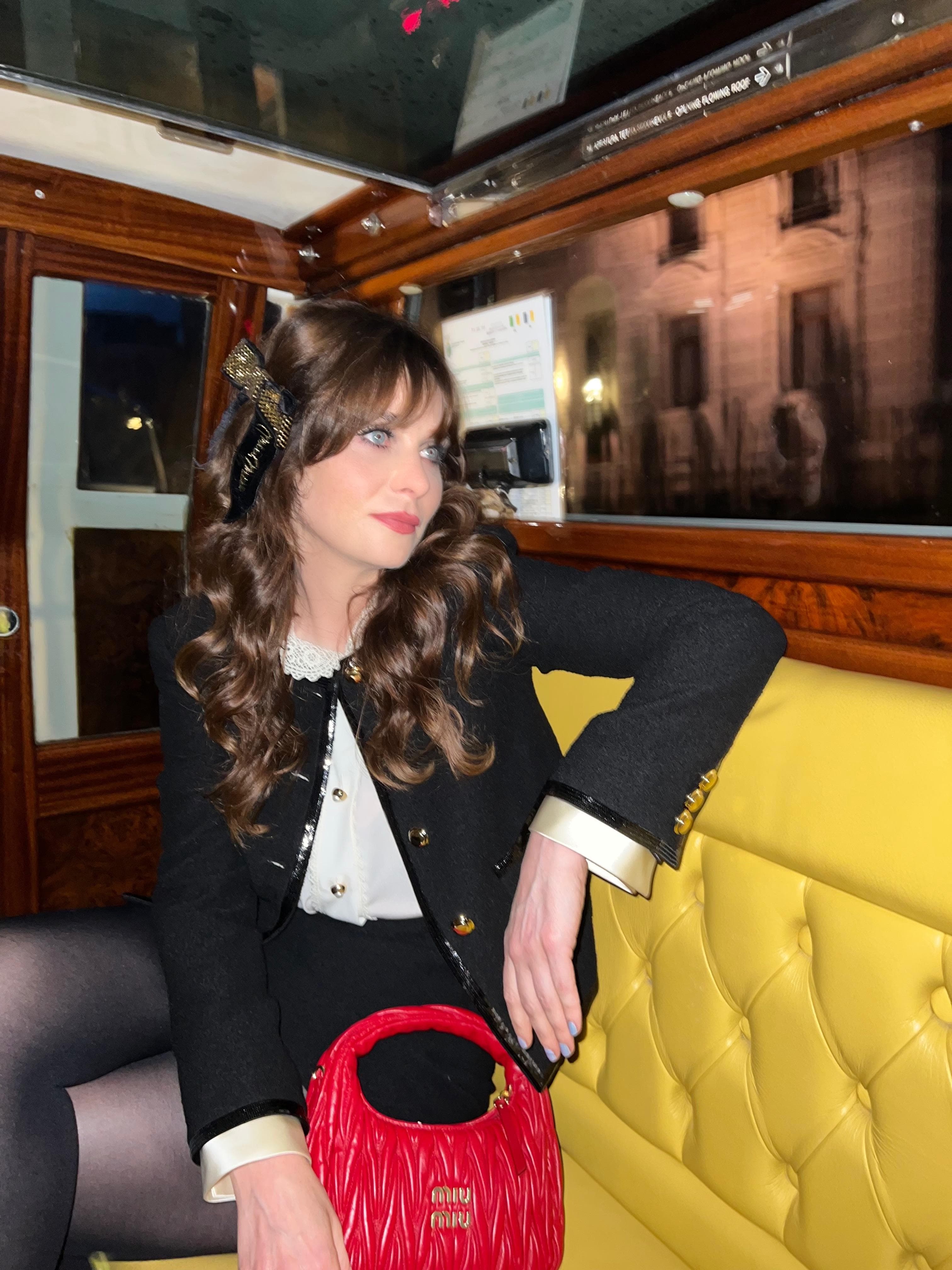 Clothes and Accessories: Miu Miu Photo: Ilaria Ieie"The black suit is all Miu Miu. I love a classic suit. It was very, very nicely tailored. The skirt was short and A-line with a kind of '60s feel to it. Then I think the bow in the hair made the outfit for me. I [like the '60s era of fashion] because of the tailoring."
